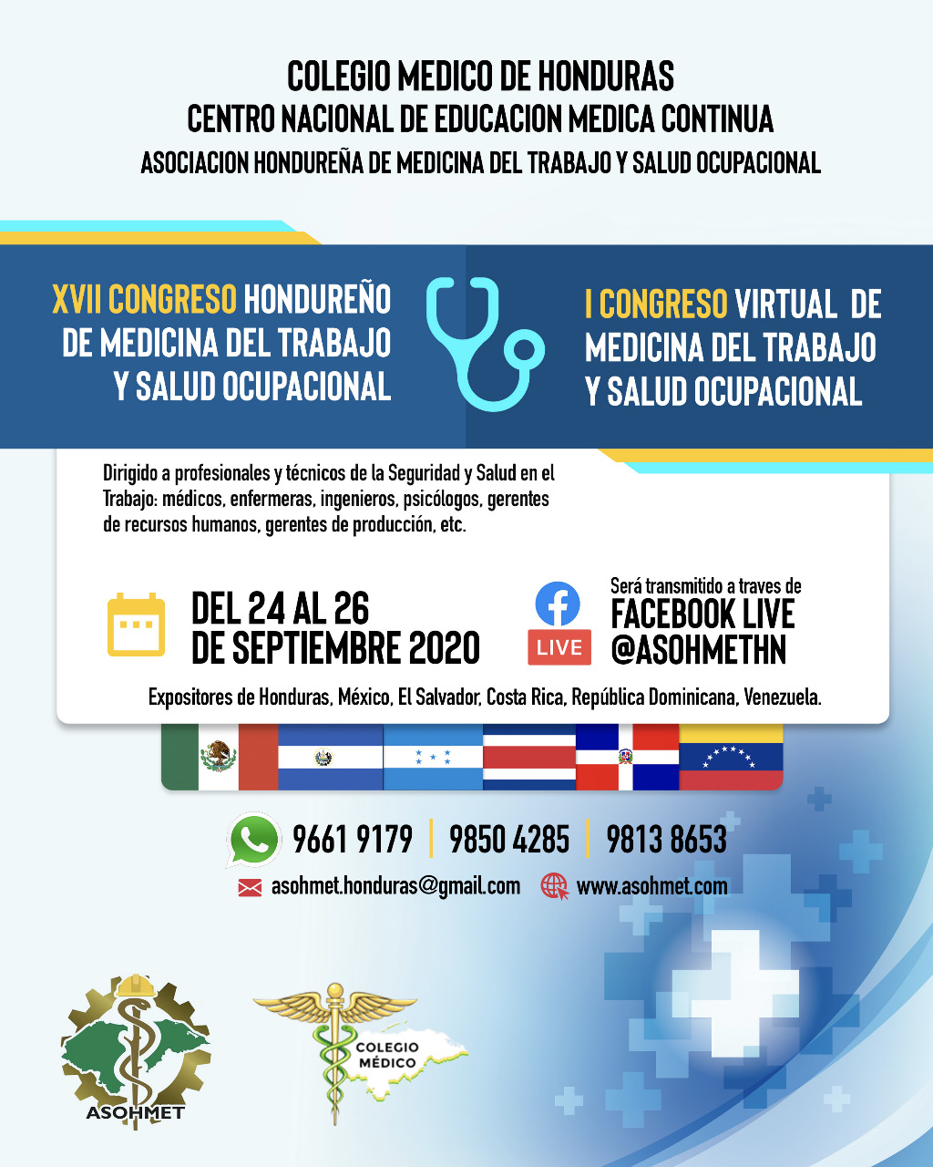 La Asociación Hondureña de Medicina del Trabajo y Salud Ocupacional (ASOHMET), el Colegio Médico de Honduras y el Centro Nacional de Educación Medica Continua (CENEMEC) tienen el placer de invitar a las actividades que se desarrollarán durante la celebración del XVII Congreso Hondureño de Medicina del Trabajo y Salud Ocupacional y el I Congreso Virtual de MT y SO.